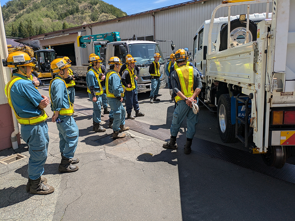 作業終了時には、新人もベテランも一同に今日の反省点を振り返り、明日の現場に生かせるよう努めております。
